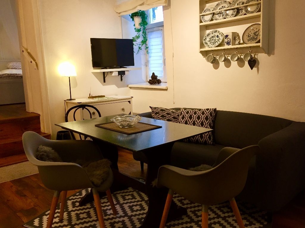 Großzügige, ca. 70m2, gemütliche Ferienwohnung im Erdgeschoss gelegen. Perfekt integriert in historischem Gemäuer, dadurch bedingt kleineres, jedoch komplett und mit Liebe zum Detail, ausgestattetes Bad/WC.