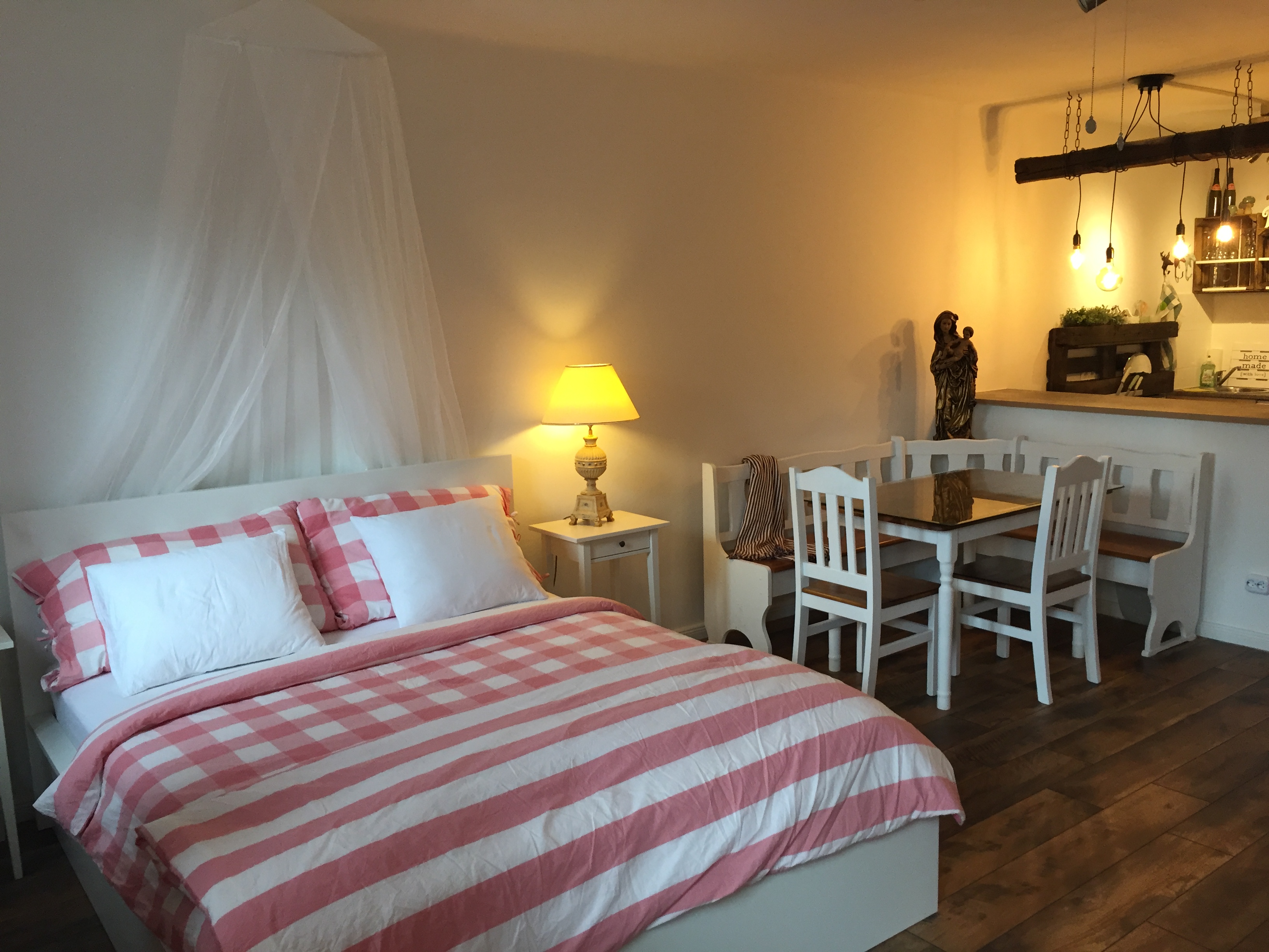 Gemütliches, modernes Studioappartement, ca. 45 m2, im ersten Stock gelegen. Mit großzügigem Wannenbad, getrenntem WC und begehbarer Garderobe. Die moderne, voll ausgestattete Küche ist durch eine Küchenbar abgetrennt vom Wohn/Schlafraum. Dieser verfügt über ein Doppelbett und ein Einzelbett, welches sich auf ein großes Doppelbett ausziehen lässt. Somit belegbar für bis zu 4 Personen.